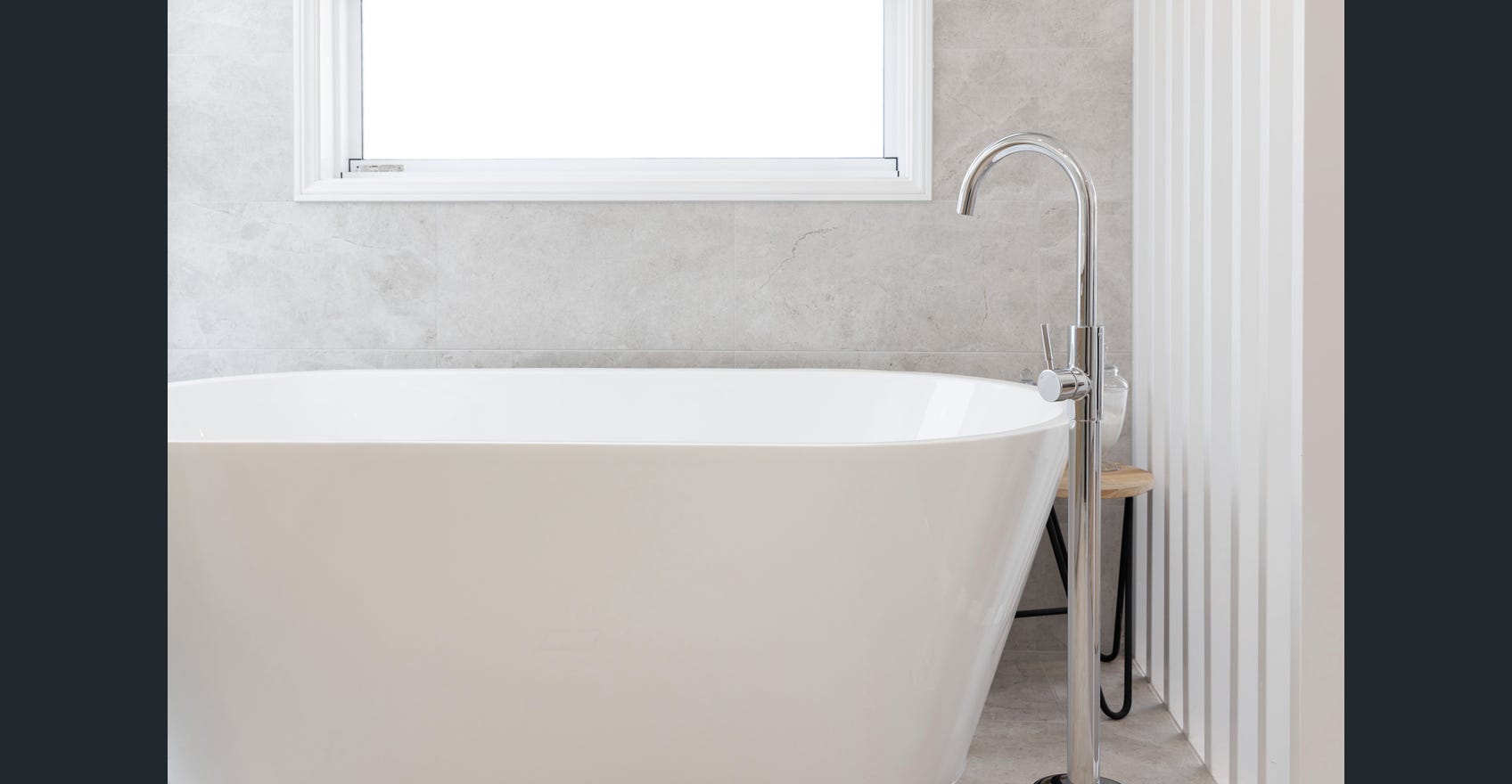 Luxury bathroom renovation in Brisbane by Jensen Constructions. Featuring a modern freestanding bathtub, glass walk-in shower, floating double vanity, and sleek neutral finishes for a spa-like retreat.